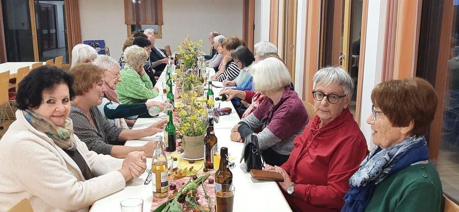 Anschließend traf man sich im Pfarrheim zum Erntedank-Hutzaabend, zu dem Rita Gleißner 30 Frauen, Herrn Pfarrer Pirner und sogar 2 Männer begrüßen konnte. Luise Köllner und Petra Irlbacher hatten die lange Tafel herbstlich geschmückt. Rita Gleißner sorgte für die musikalische Unterhaltung mit der Steirischen Harmonika. Zu Beginn trug das Vorstandsteam besinnliche Gedanken zum Erntedank und zum Thema Dankbarkeit vor. Pfarrer Pirner sprach ein Segensgebet und lud zum Tischgebet ein, bevor sich alle am herbstlichen Buffet stärken konnten. Es gab Kartoffeln mit Kräuterquark, Obazdn, Erdäpfelkas, deftige Wurst, Weißwurstsalat, Flammkuchenbrezen und Bauernbrot. Diese Speisen hatten die Mitglieder des Führungskreises zubereitet. Die Brotzeit schmeckte wunderbar und alle verbrachten einen unterhaltsamen Abend in gemütlicher Runde.