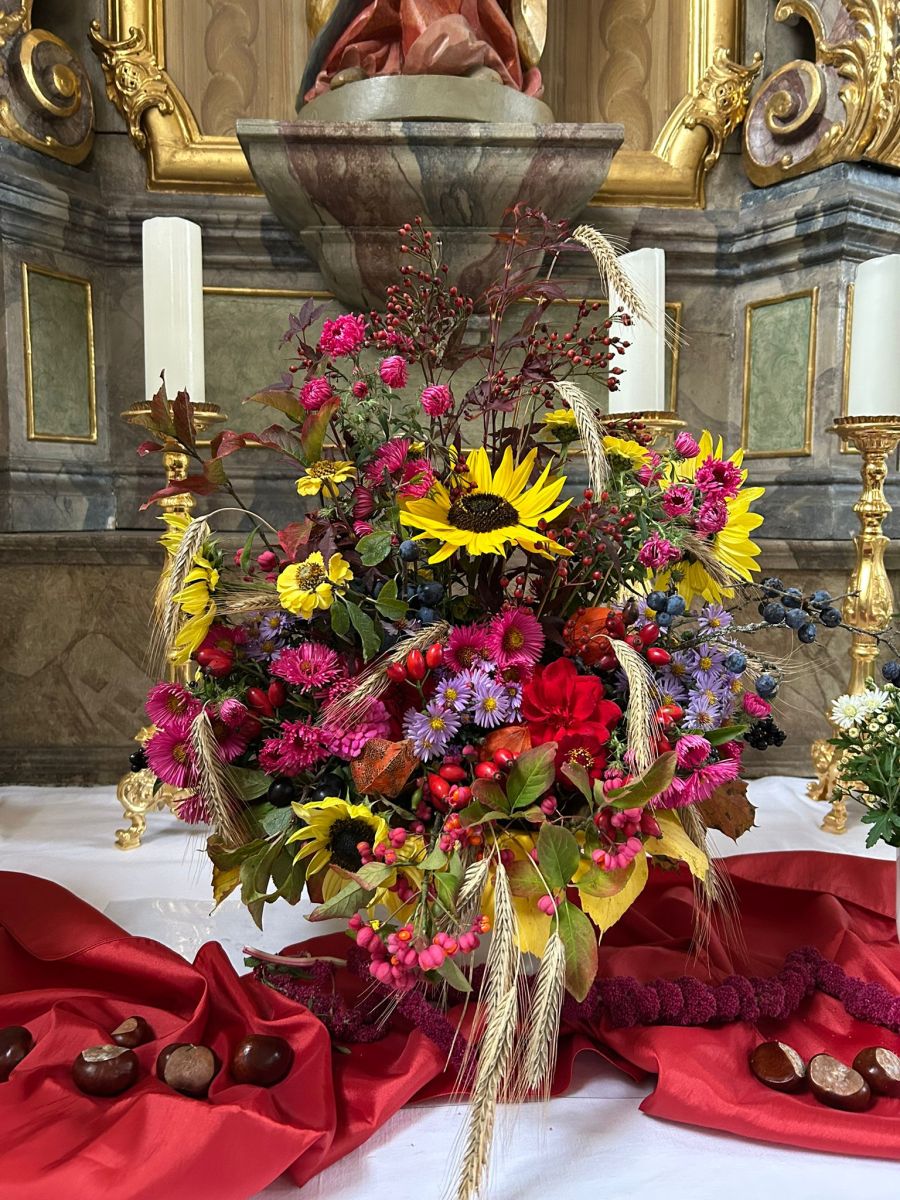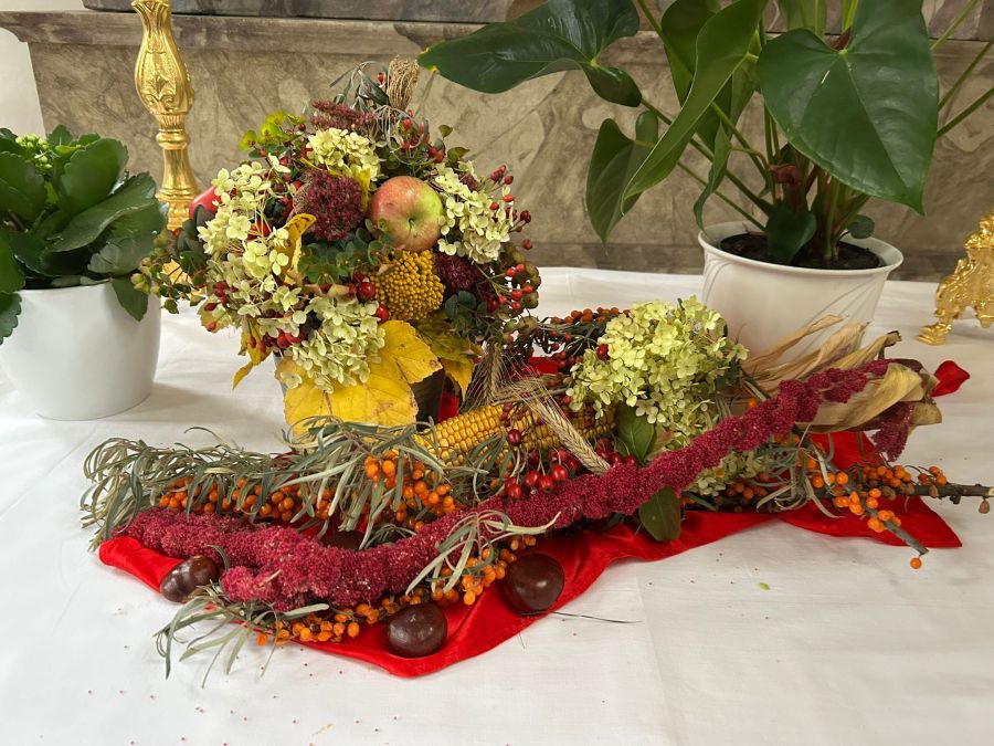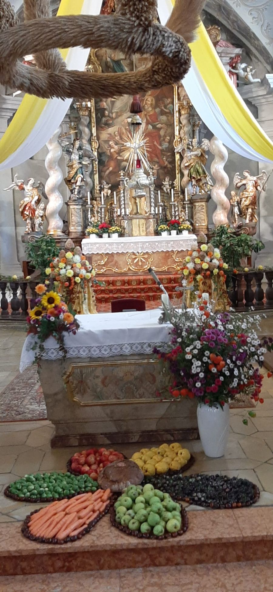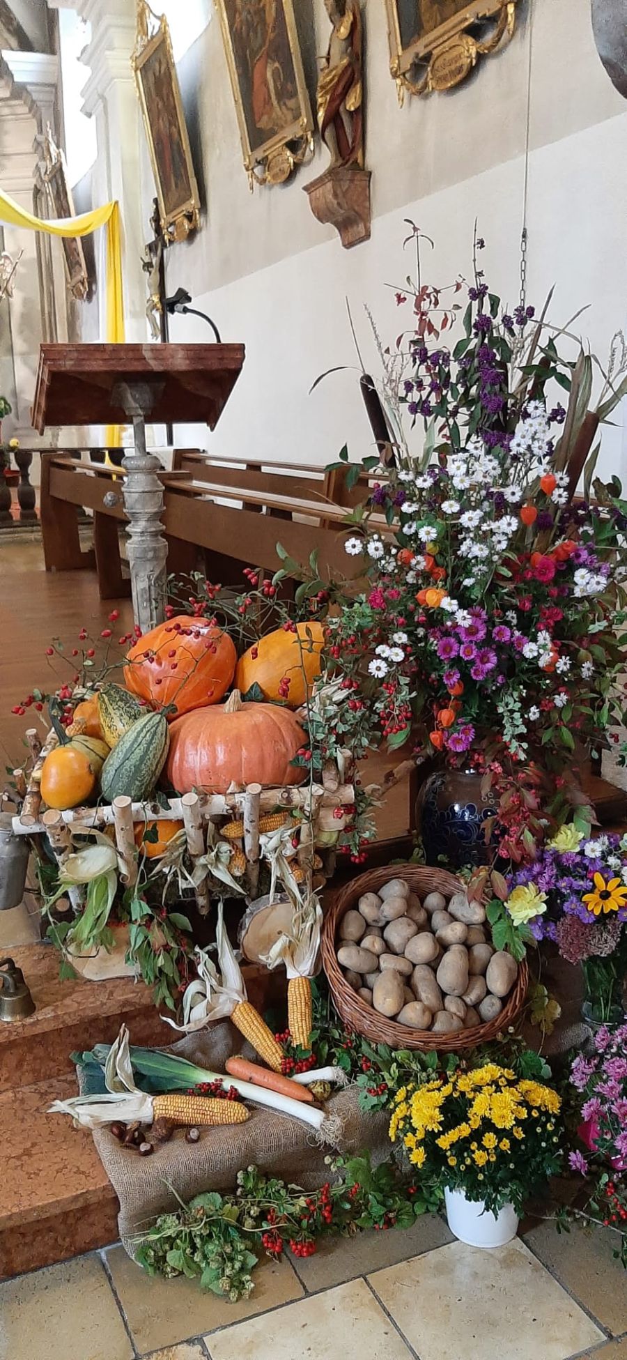 Die Kirchen waren herrlich geschmückt mit den Gaben der Schöpfung. Blumen, Obst, Gemüse und Getreide boten ein herrlich buntes Bild und stellten den Gläubigen vor Augen, wie reich Gott uns in diesem Jahr wieder beschenkt hat.