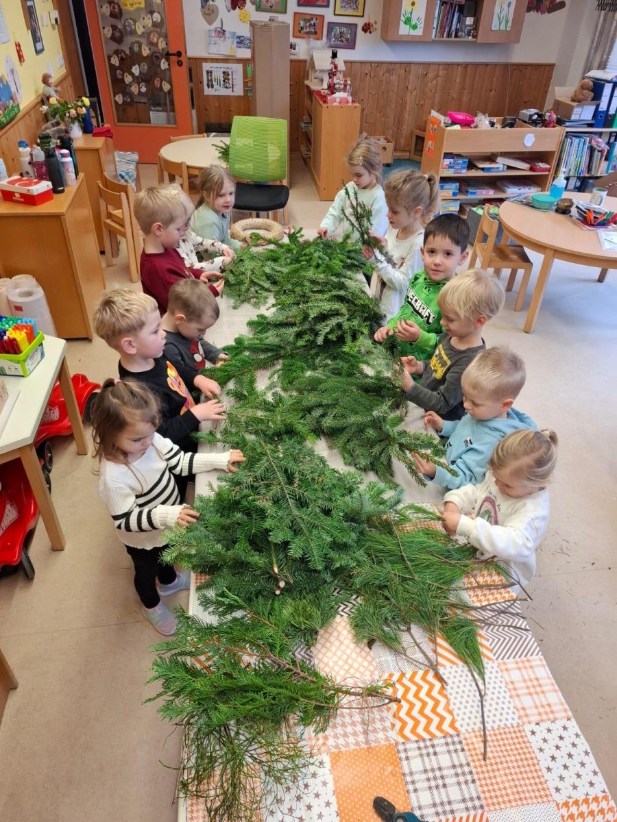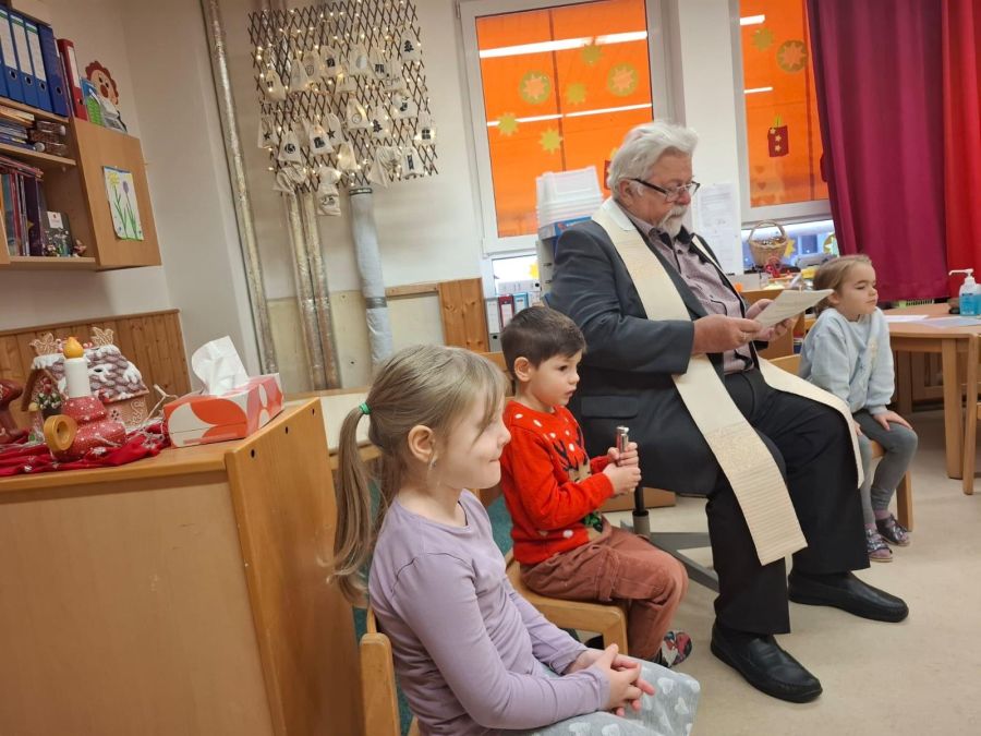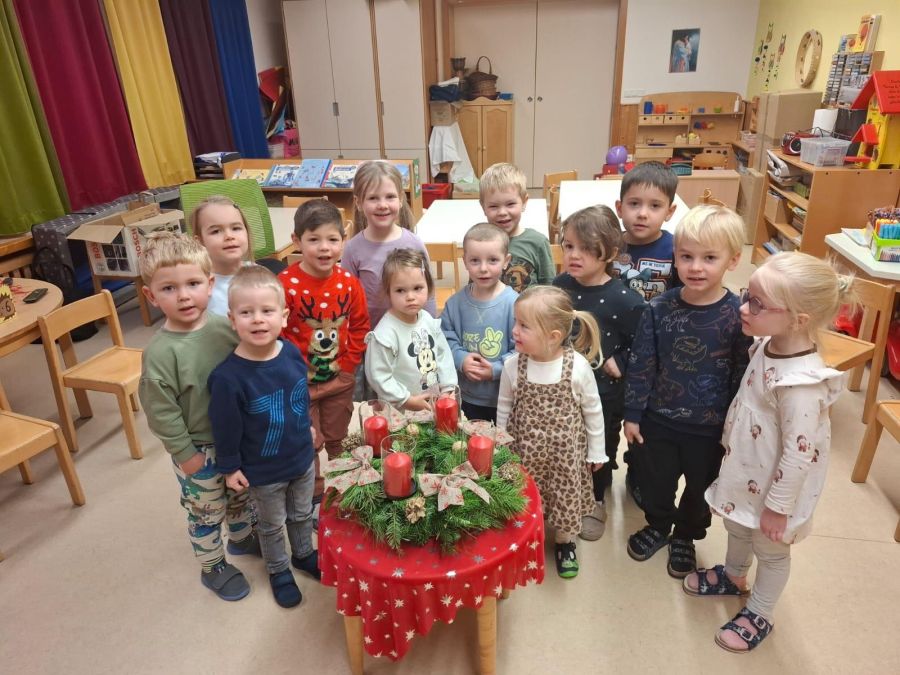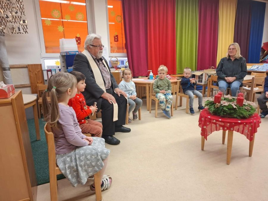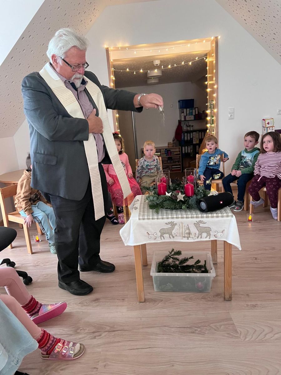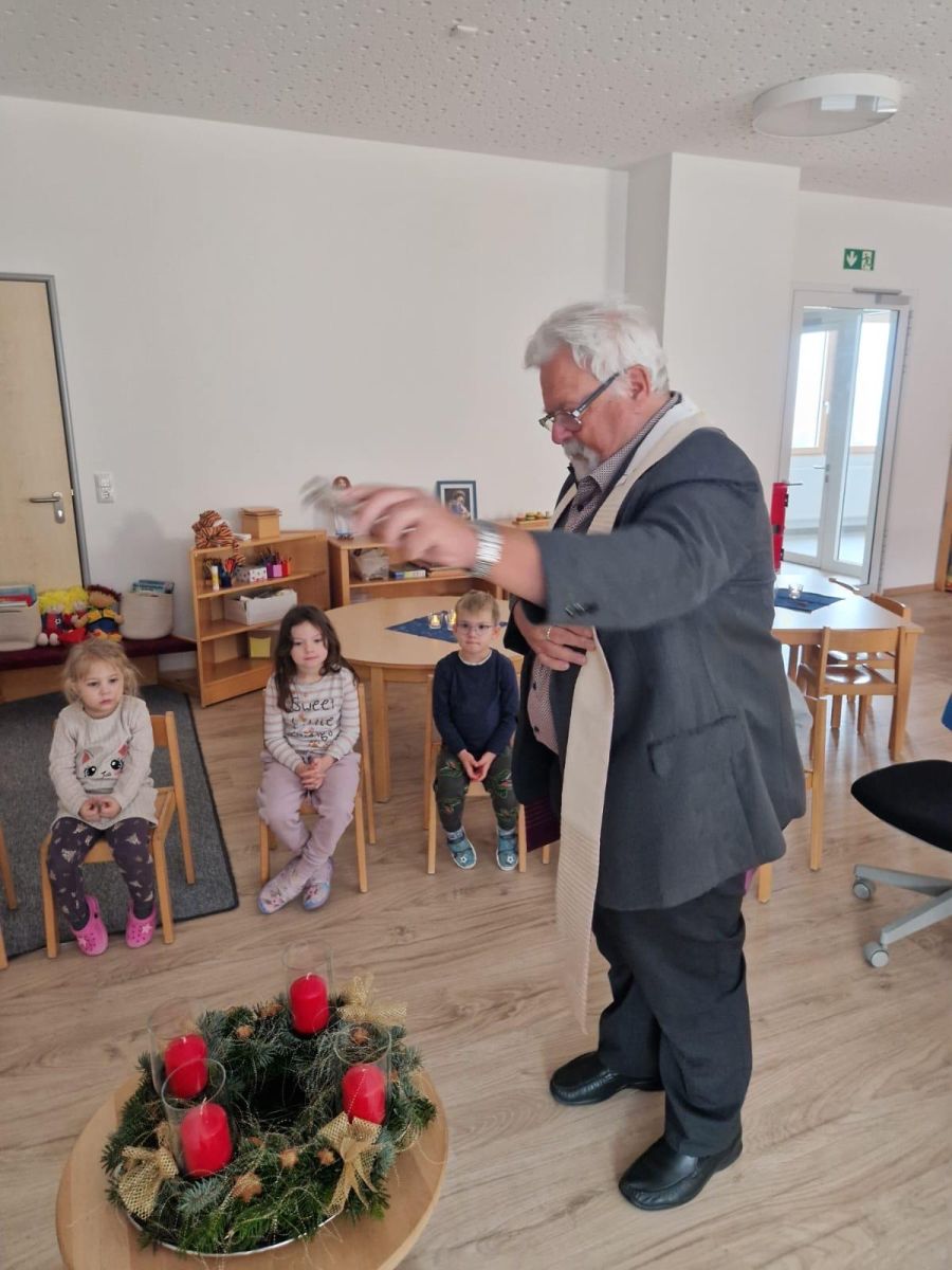 Herr Pfarrer Arnold Pirner segnete in allen Gruppen des Kinderhauses, die individuell gestalteten Adventskränze. Die Kinder hatten sie im Vorfeld gemeinsam mit ihren Erzieherinnen gebunden und geschmückt.