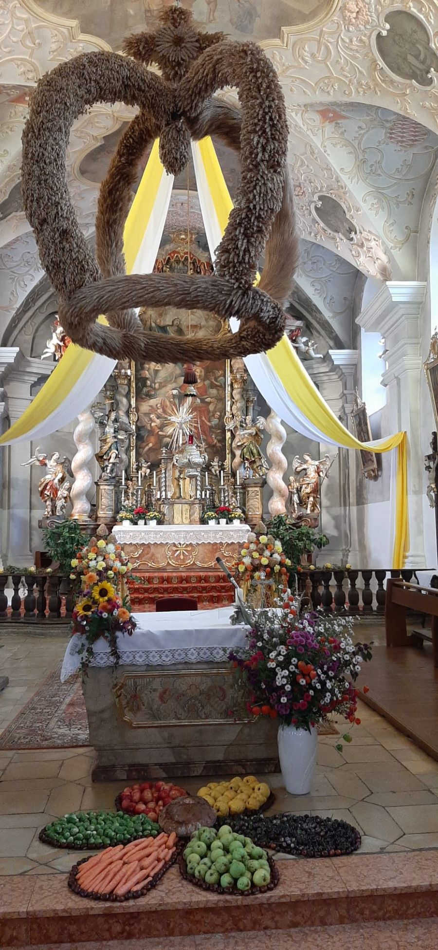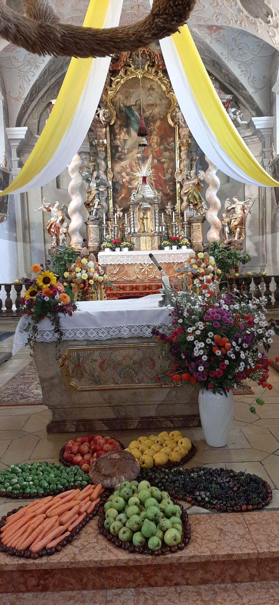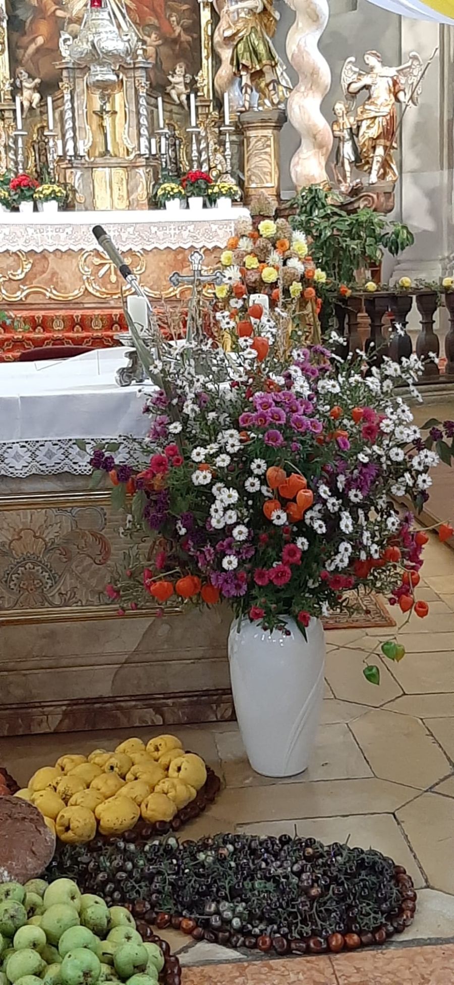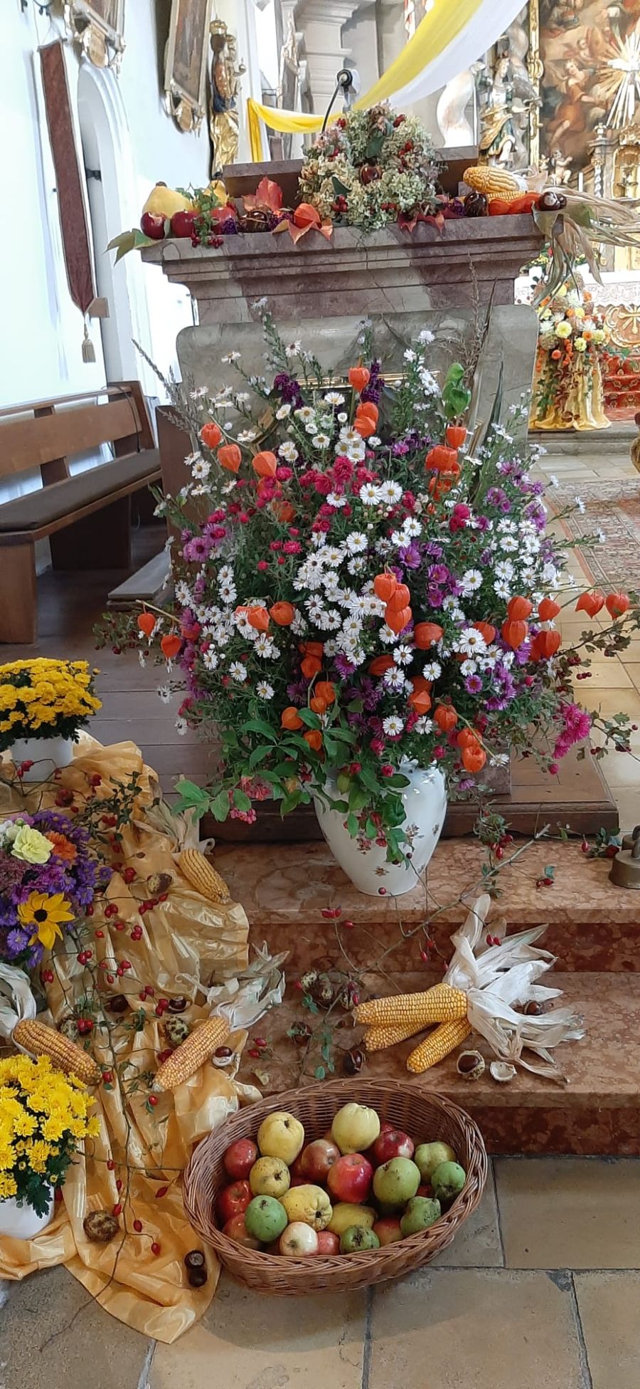 Die Kirchen waren herrlich geschmückt mit den Gaben der Schöpfung. Blumen, Obst, Gemüse und Getreide boten ein herrlich buntes Bild und stellten den Gläubigen vor Augen, wie reich Gott uns in diesem Jahr wieder beschenkt hat.