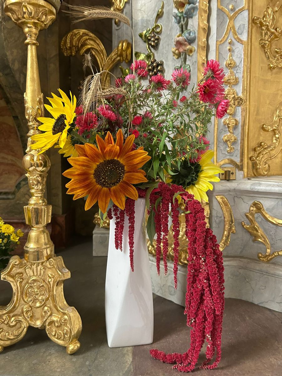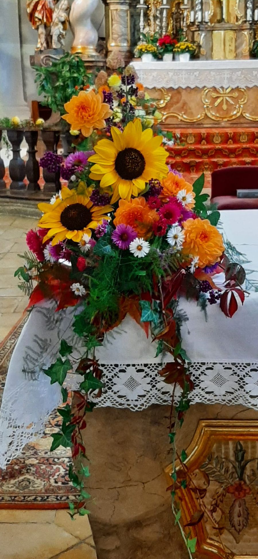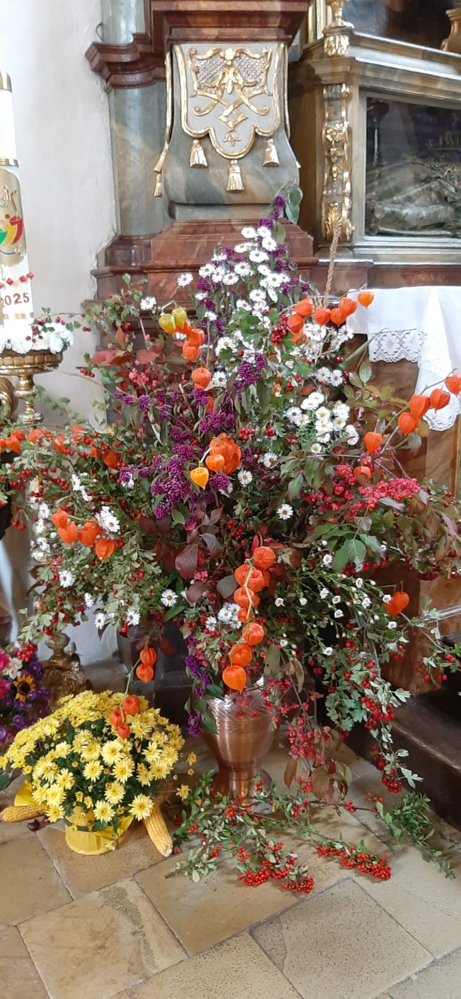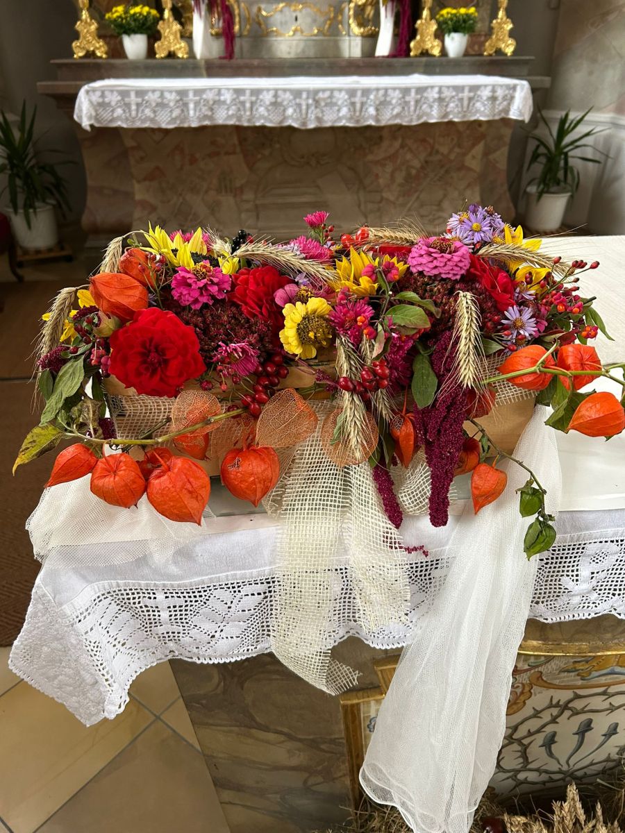 Die Kirchen waren herrlich geschmückt mit den Gaben der Schöpfung. Blumen, Obst, Gemüse und Getreide boten ein herrlich buntes Bild und stellten den Gläubigen vor Augen, wie reich Gott uns in diesem Jahr wieder beschenkt hat.