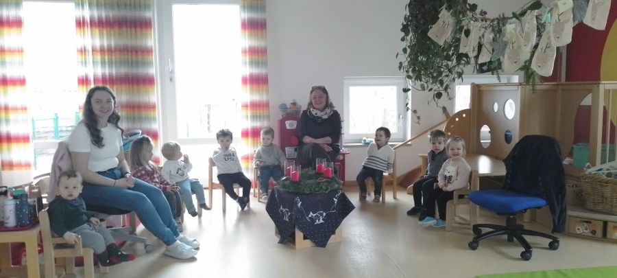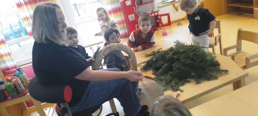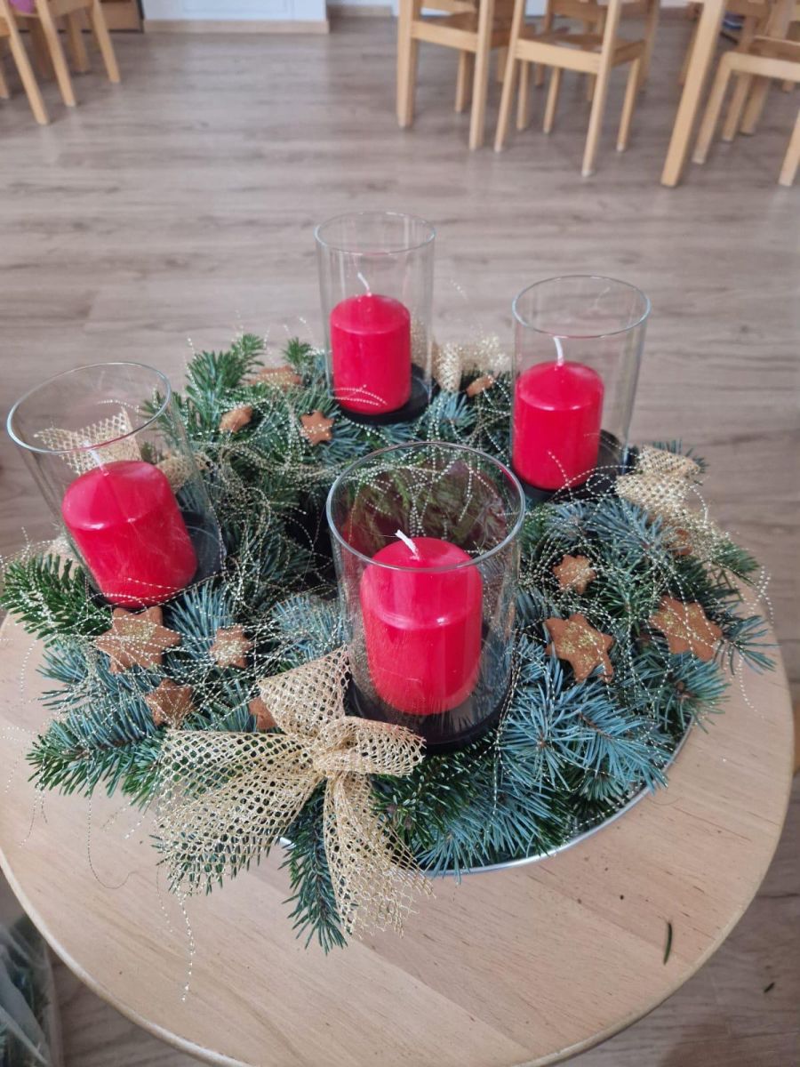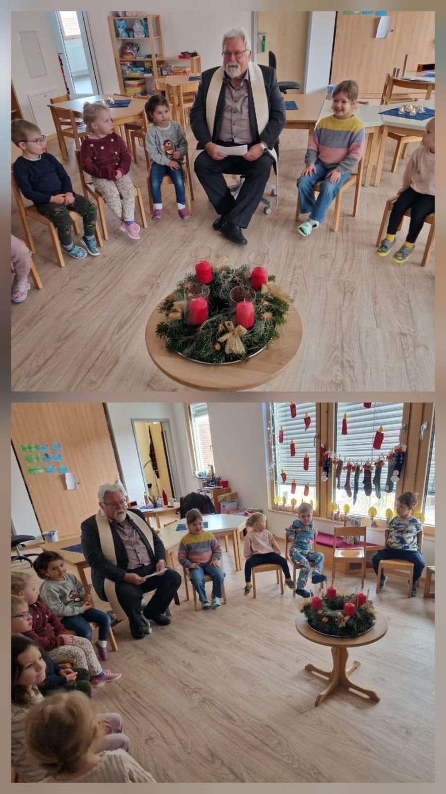 Herr Pfarrer Arnold Pirner segnete in allen Gruppen des Kinderhauses, die individuell gestalteten Adventskränze. Die Kinder hatten sie im Vorfeld gemeinsam mit ihren Erzieherinnen gebunden und geschmückt.