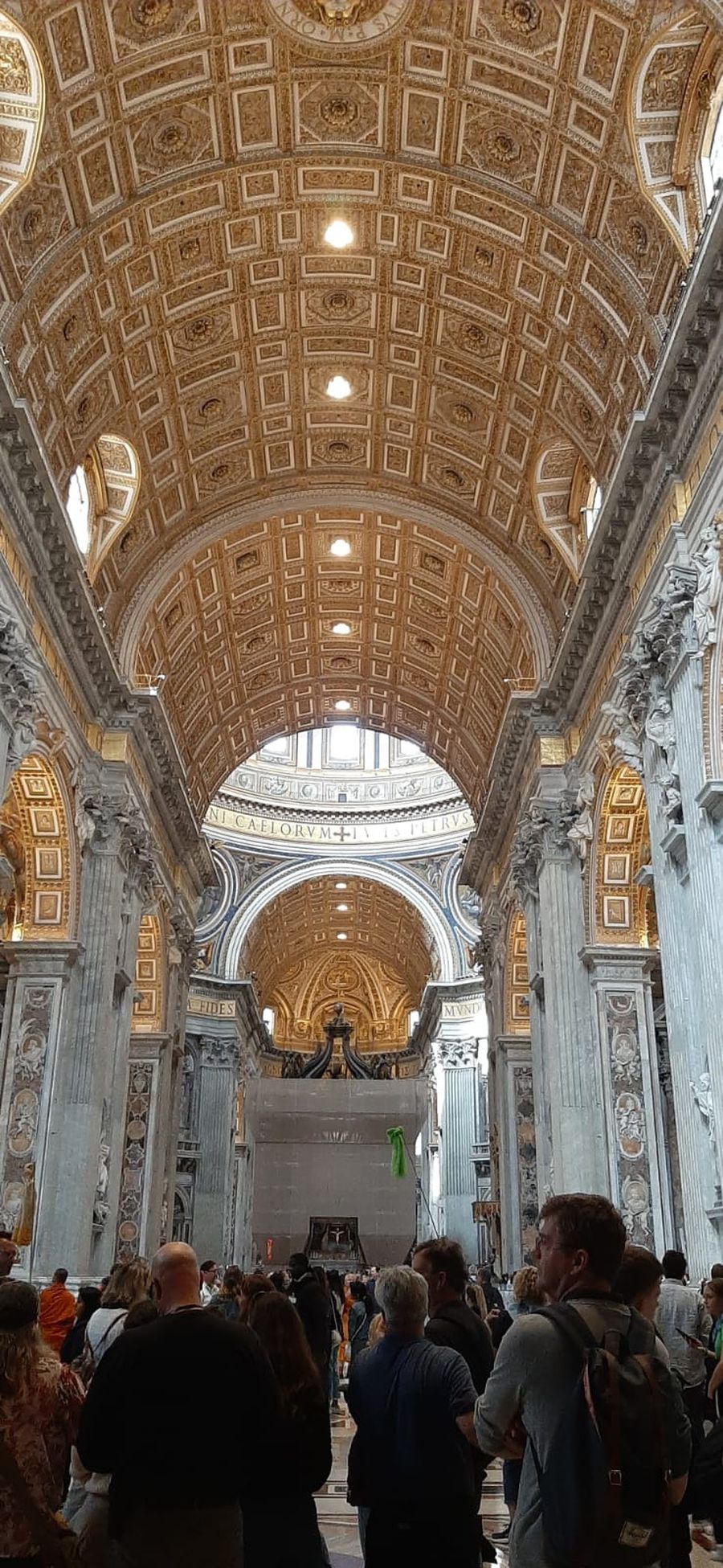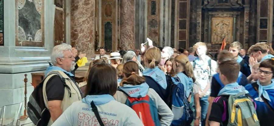 Der Freitag stand ganz im Zeichen des Vatikans. Am Vormittag hieß es erst mal sehr lange Schlange stehen an den Sicherheitskontrollen vor dem Einlass in den Petersdom, den die Minis bei einer Führung ausführlich besichtigten. Dazu gehörte auch der Besuch der Papstgräber unter dem Petersdom. Anschließend folgte der anstrengende Aufstieg zur Peterskuppel; der überwältigende Ausblick von oben auf die Stadt Rom entschädigte aber für alle Strapazen.